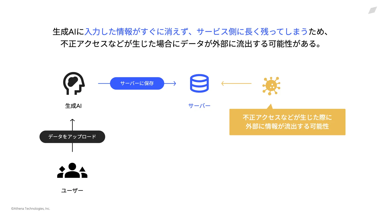 セキュアな環境で生成AIを利用することは、情報漏洩のリスクや、入力したデータが外部に残ってしまうリスクを下げるために重要です。
