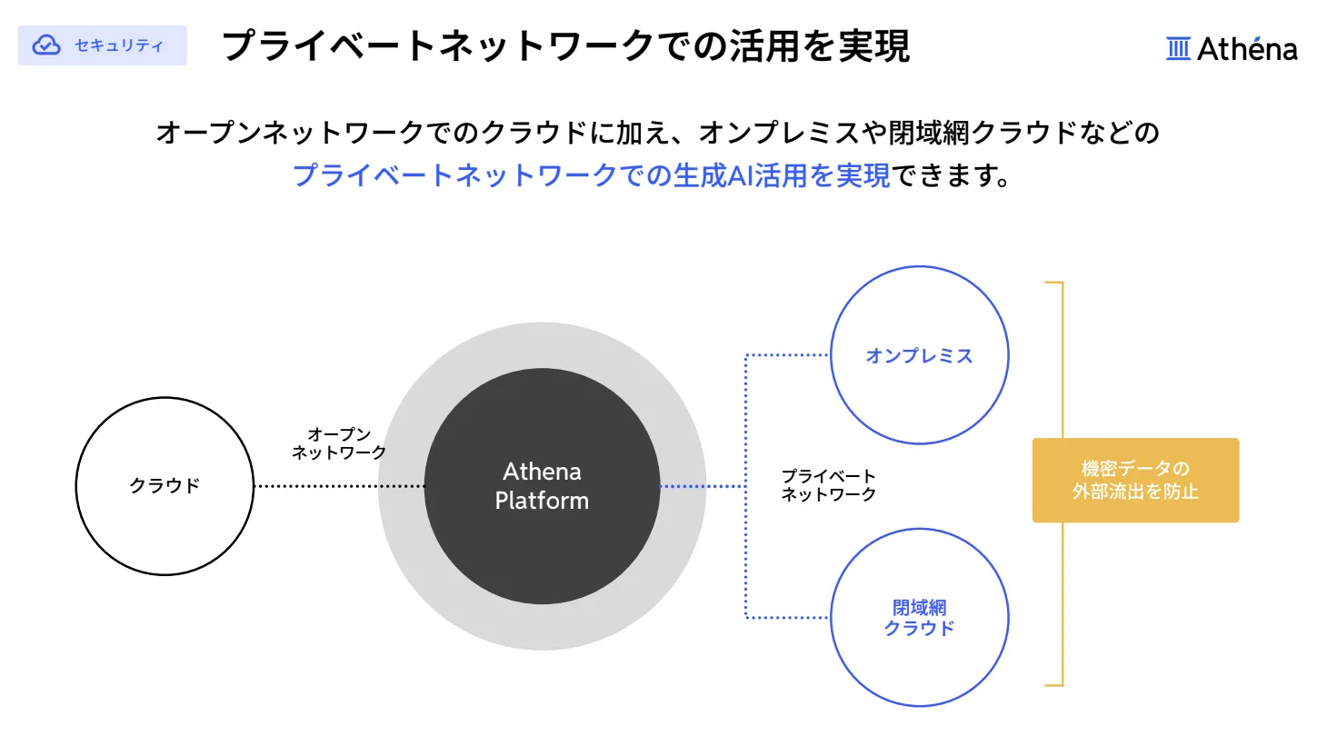 Athena Platformは、業務データを外部に出さずに生成AIを使える構成を想定しています。