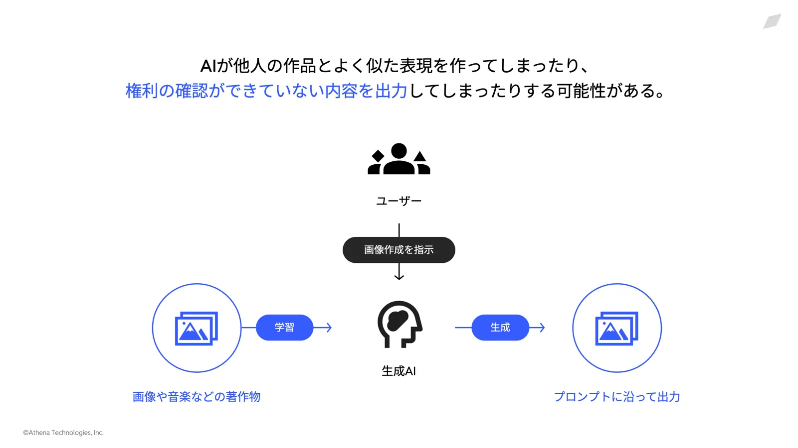 生成AIは多くの情報を参考にして答えを作るため、元となった作品の表現に近い内容が出てくる場合があります。それをそのまま公開したり、仕事で使ったりすると、著作権や知的財産の問題になることがあります。