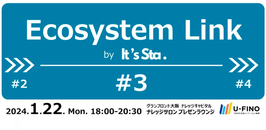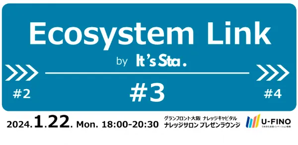 Ecosystem Linkとは、スタートアップ、事業会社の新規事業/オープンイノベーション担当者、金融機関、士業、行政、支援機関など、イノベーションに挑戦する人が集い、情報や技術・知識等を共有し、自ら発信していくコミュニティであるIt’s Sta.(Innovators & Trailblazers Synergy Station)において、スタートアップ・エコシステムに関するセッションと注目のスタートアップのピッチを行う、一般社団法人うめきた未来イノベーション機構(U-FINO)主催のイベントです。