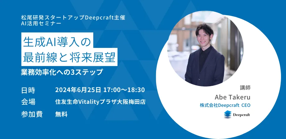 2024年 6/25(火)に生成AIの導入を検討されている事業者様向けに、関西を拠点とする東大松尾研発AIスタートアップであるDeepcraftがセミナーを開催いたします
